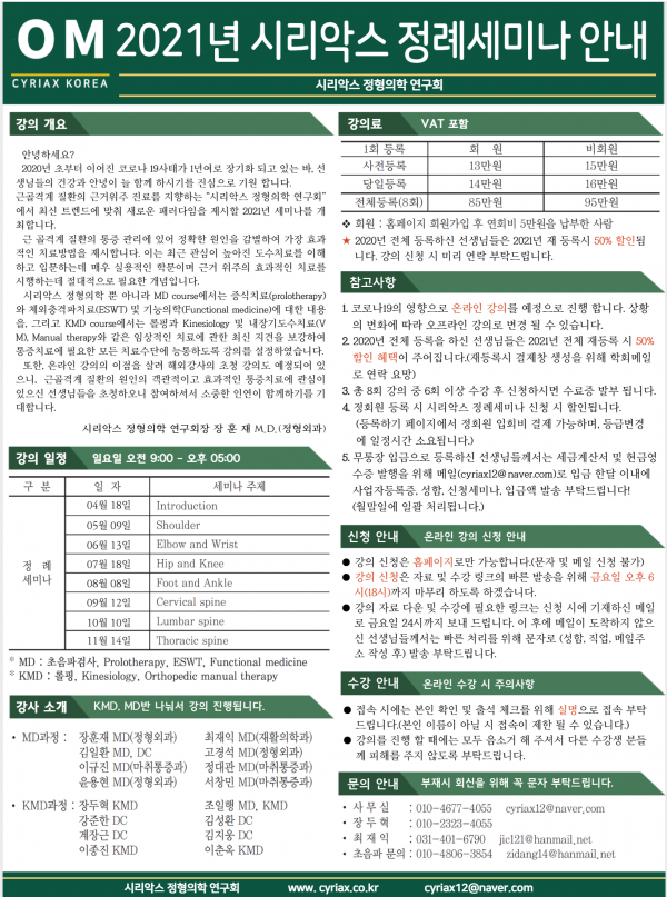2020³âÀ» ¸Â¾Æ ½Ã¸®¾Ç½º Á¤ÇüÀÇÇÐ »Ó ¾Æ´Ï¶ó, MD course¿¡¼´Â Áõ½ÄÄ¡·á(prolotherapy)¿Í ü¿ÜÃæ°ÝÆÄÄ¡·á(ESWT) ¹× ±â´ÉÀÇÇÐ(Functional medicine)¿¡ ´ëÇÑ ³»¿ëÀ», ±×¸®°í KMD course¿¡¼´Â ·ÑÇΰú Kinesiology ¹× ³»Àå±âµµ¼öÄ¡·á(VM), Manual therapy¿Í °°Àº ÀÓ»óÀûÀÎ Ä¡·á¿¡ °üÇÑ ÃֽŠÁö°ßÀ» º¸°ÇÏ¿© ÅëÁõÄ¡·á¿¡ ÇÊ¿äÇÑ ¸ðµç Ä¡·á¼ö´Ü¿¡ ´ÉÅëÇϵµ·Ï °ÀÇ ÁÖÁ¦¸¦ ¼³Á¤ ÇÏ¿´½À´Ï´Ù.