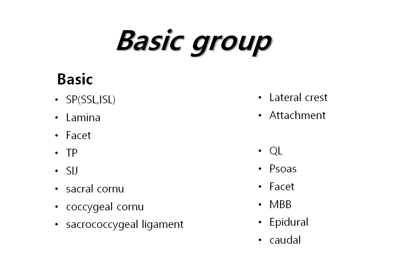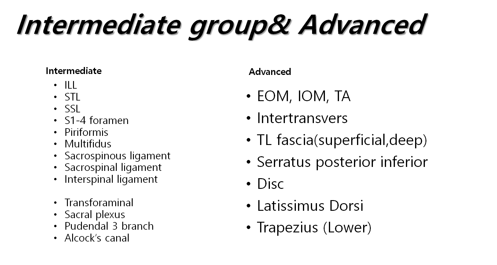 Intermediate Advanced groupÀº °üÀý¿¡ ´ëÇÑ ÃÊÀ½ÆÄ°Ë»ç´Â Æ÷ÇÔµÇÁö ¾Ê°í °üÀý ÁÖº¯ÀÇ ¶Ç´Â ±ÙÀ§ºÎÀÇ ¹Ì¼¼½Å°æÀ» °üÂû. ½Ç½ÀÇÏ´Â ±³À°ÄÚ½º·Î °üÀýÃÊÀ½ÆÄ°Ë»ç´Â ¿øÈ°Çϳª neural prolotherapy¸¦ º¸´Ù È¿°úÀûÀ¸·Î Çϱâ À§ÇÑ °øºÎ¸¦ ¿øÇϽô ºÐµéÀ» À§ÇÑ ±³À°ÀÔ´Ï´Ù. Âü¿©ÇϽô ºÐµéÀº º»ÀÎÀÇ ´É·Â ¶Ç´Â Èñ¸Á¿¡ µû¶ó ÇϳªÀÇ °úÁ¤À» ¼±ÅÃÇÏ¿© ½ÅûÇÏ½Ã¸é µË´Ï´Ù.(µî·ÏÇϽǶ§ ÃʱÞ/Áß»ó±ÞÀ¸·Î ¸»¾¸ÇØÁÖ¸é µË´Ï´Ù.) ´ë Ç¥ ° »ç
