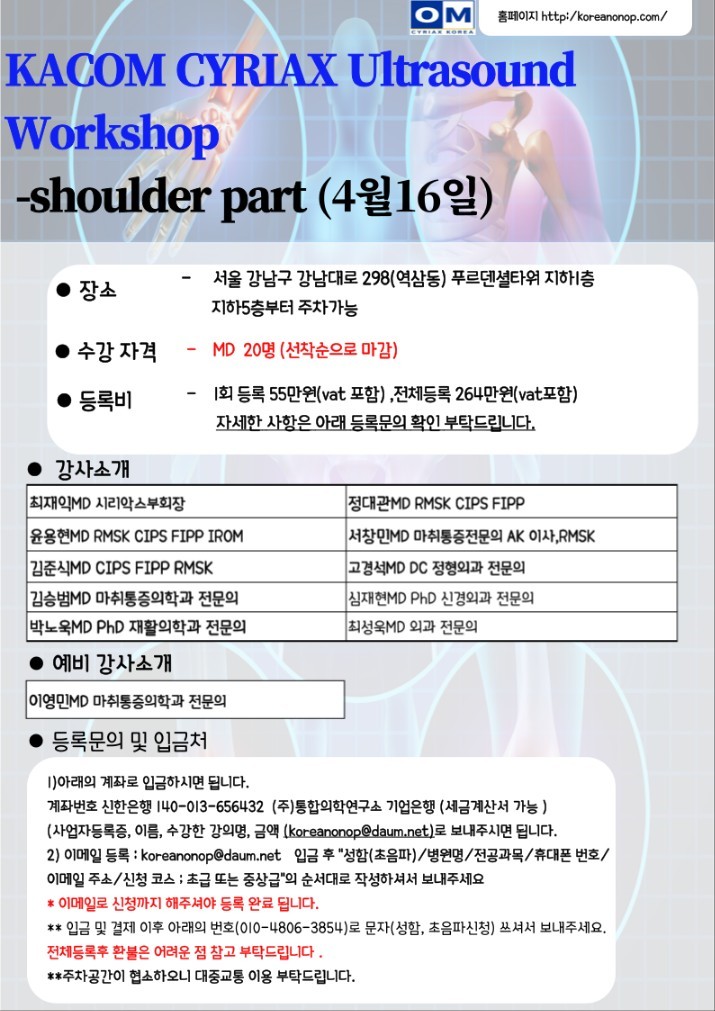 | °ÀǸí : [±Ù°ñ°Ý°è ÃÊÀ½ÆÄ] [4¿ù16ÀÏ]2023³âMusculoskeletal Ultrasound ¿öÅ©¼¥ ¾È³»[Shoulder] | |||