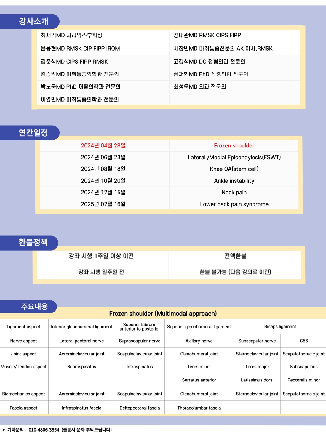 ÁøÇà³»¿ëÀº ÁúȯÀ» Á¤ÇÏ°í ±×¿¡ µû¸¥ Joint, Ligament, Tendon, Muscle, Nerve, Biomechanics, FasciaµîÀÇ ´Ù¾çÇÑ °üÁ¡¿¡¼ Áø´Ü°ú Ä¡·á¿¡ Á¢±ÙÇÒ ¼ö ÀÖ´Â Multimodal approach ¹æ½ÄÀ» ¹è¿ìµµ·Ï ±¸¼ºµÇ¾î ÀÖ½À´Ï´Ù. ¼ö°»ý ¿©·¯ºÐÀÌ µ¹¾Æ°¡¸é¼ °¢ °»ç¿¡°Ô À§¿¡ ´ëÇÑ ³»¿ëµéÀ» ±³À°¹Þ°Ô µË´Ï´Ù. ¶ÇÇÑ Á¤Àû Áø´ÜÀ» ³Ñ¾î ÃÊÀ½ÆÄ¸¦ ÀÌ¿ëÇÑ dynamic examination, motion palpation µîÀ» ÅëÇØ Áø´ÜÇÏ´Â µ¿Àû Áø´Ü ¹æ¹ýÀ» ¾Ë·Áµå¸³´Ï´Ù. ÀúÈñ IARMÀº 1³â °úÁ¤ÀÇ ¿öÅ©¼¥ ÄÚ½º·Î ÀÌ·ç¾îÁ® ÀÖÀ¸¸ç, ¼Ò¼ö Àοø¸¸ ¹Þ¾Æ Advance ÇÑ ¼ö¾÷À» ÁøÇàÇÕ´Ï´Ù.