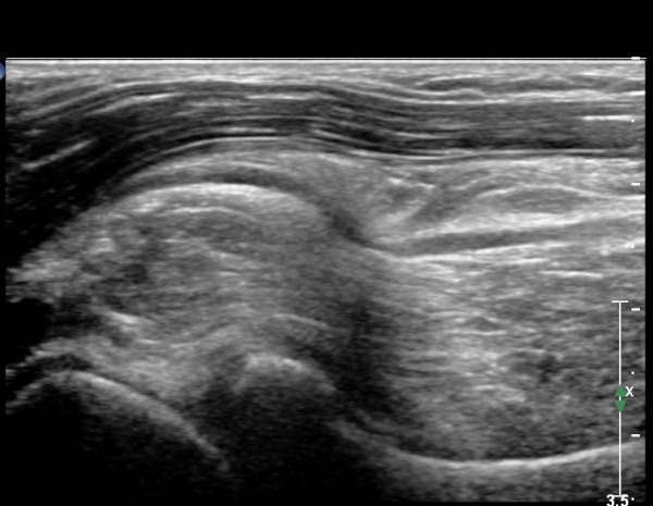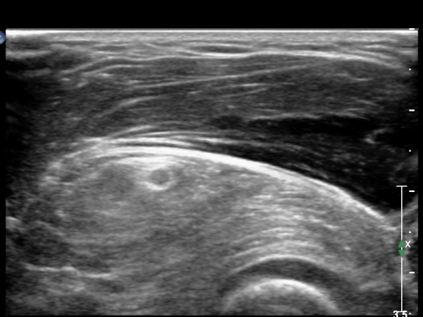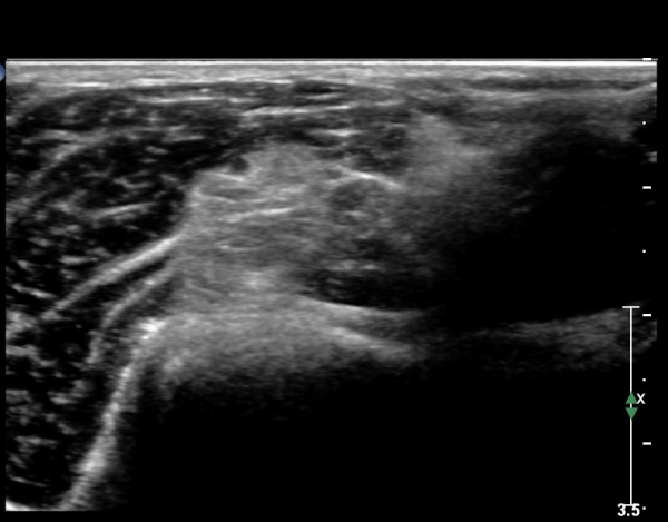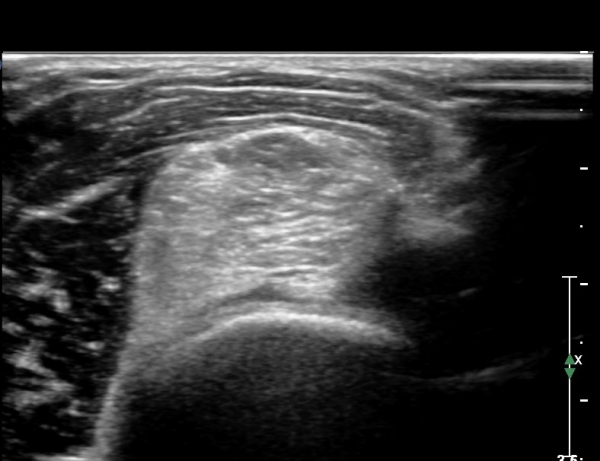 ÃÊÀ½ÆÄ ¼Ò°ß ÆÈ²ÞÄ¡ ¾Õ Ȳ´Ü¸é °Ë»ç¿¡¼ ¼ÒµÎ Àü¸é¿¡ ÀÌÁú¼º °í¿¡ÄÚ(heterogenous htperechoic)ÀÇ Á¾±«(mass)°¡ Èİñ°£½Å°æÀ» Ç¥ÃþÀ¸·Î ÀüÀ§½ÃŰ´Â ¾ç»óÀ¸·Î °üÂûµÊ(»çÁø 1).