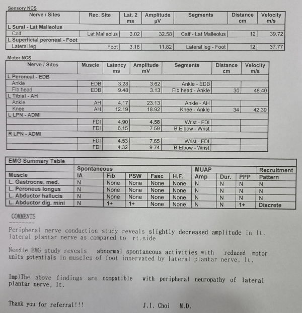 ±ÙÀüµµ °Ë»ç : ½ÉÇÑ ¾Æ·¡ µÚ²ÞÄ¡ ½Å°æ º´Áõ(severe peripheral neuropathy of inferior calcaneal nerve) (»çÁø 7).