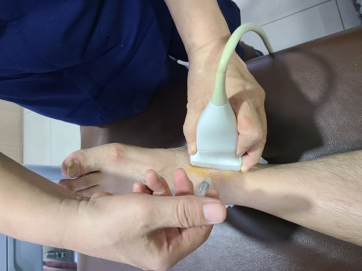 ¸Í½ÃÇÏ¿¡¼ ÁÖ»ç ¹æ¹ýÀº Àü°æ°ñ°Ç(tibialis anterior) ³»Ãø¿¡¼ ¾à 20µµ ³»Ãø ¹æÇâÀ¸·Î ÁÖ»ç¹Ù´ÃÀ» »ðÀÔÇÏ¿© ¿¬°ñ°ú Á¢ÃËÀÌ µÇ¸é Á¢ÃËÀ» À¯ÁöÇÑ Ã¤·Î Áֻ縦 ½ÃÇàÇ쵂 ÁÖ»ç¾×ÀÌ ºÎµå·´°Ô Áֻ簡 ¾ÈµÇ´Â °æ¿ì¿¡´Â ÁÖ»ç ¹Ù´ÃÀ» ¹Ì¼¼ÇϰÔ(¾à 0.5 mm) »« ÈÄ Áֻ縦 ½ÃÇàÇÑ´Ù. ÁÖ»ç ¹Ù´ÃÀÌ ¿¬°ñ(°Å°ñ)¿¡ Á¢ÃËÇÑ °æ¿ì¿Í »À(°æ°ñ)¿¡ Á¢ÃËÇÑ °æ¿ì´Â ´À³¦ÀÌ ´Ù¸£´Ù. »À¿¡ Á¢ÃËÇÑ °æ¿ì¿¡´Â ´ú°Å´ö °Å¸®´Â ´À³¦ÀÌ°í ¿¬°ñ¿¡ Á¢ÃËÇÑ °æ¿ì¿¡´Â ºÎµå·´°Ô Àܵð¹ç¿¡ Á¢ÃËÇÏ´Â ´À³¦ÀÌ´Ù.