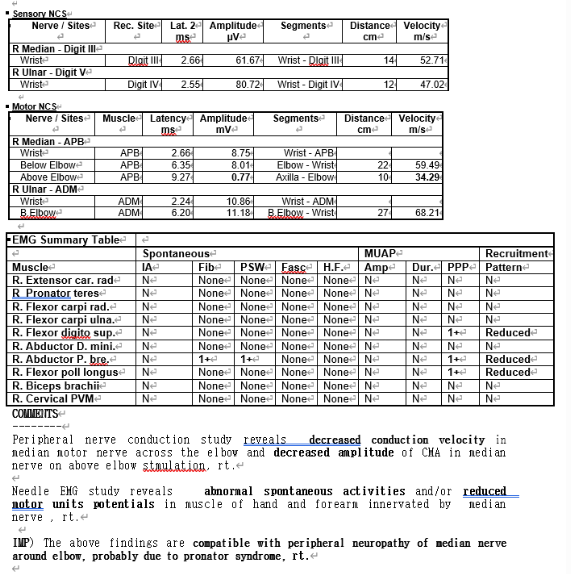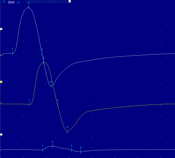 ±ÙÀüµµ °Ë»ç :Á¤Á߽Űæ Àüµµ°Ë»ç¿¡¼ ÆÈ²ÞÄ¡ »ó¹æ¿¡¼ ÀÚ±Ø ½Ã ¿îµ¿½Å°æ ¹ÝÀÀÀÇ ÁøÆøÀÌ ¸Å¿ì °¨¼ÒµÇ°í(»çÁø 13) ÆÈ²ÞÄ¡¸¦ °æÀ¯ÇÏ´Â ±¸°£¿¡¼ ½Å°æÀüµµ ¼ÓµµÀÇ °¨¼Ò¸¦ º¸ÀÓ(»çÁø 12) ħ±ÙÀüµµ °Ë»ç¿¡¼ ȸ³»±Ù¿¡¼´Â Á¤»ó ¼Ò°ßÀ» º¸ÀÌ°í ±× ¸»´ÜÀÇ ±ÙÀ°¿¡¼ ºñÁ¤»ó ÀÚ¹ßÀüÀ§³ª ¿îµ¿½Å°æ ´ÜÀ§ÀÇ °¨¼Ò¸¦ º¸¿© ÀüÇüÀûÀΠȸ³»±Ù ÁõÈıº¿¡ ºÎÇÕÇÏ´Â ¼Ò°ßÀ» º¸ÀÓ. ¼Õ¸ñ¿¡¼ °¨°¢½Å°æÀº Á¤»ó¼Ò°ßÀ» º¸ÀÓ(»çÁø 14)